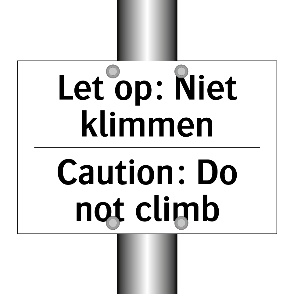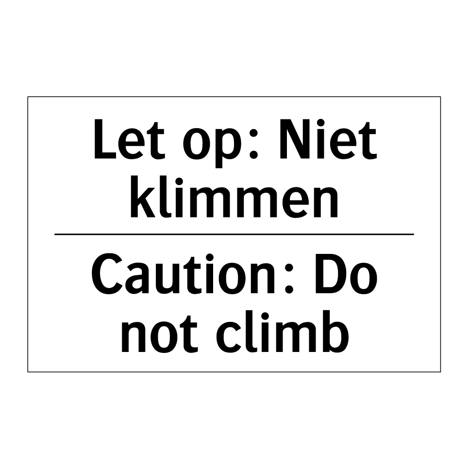 Verbodsbord met de tekst Let op: Niet klimmen en in het Engels: Caution: Do not climb