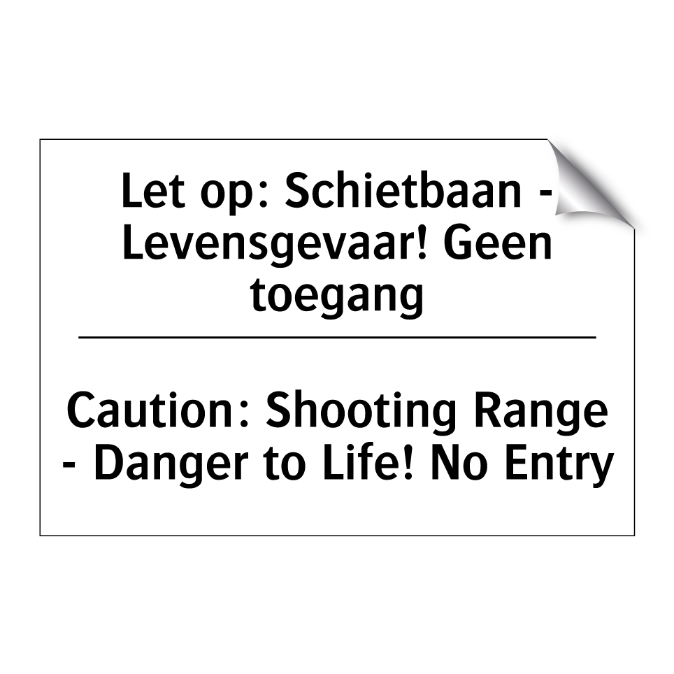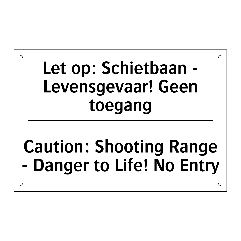 Verbodsbord met de tekst Let op: Schietbaan - Levensgevaar! Geen toegang en in het Engels: Caution: Shooting Range - Danger to Life! No Entry