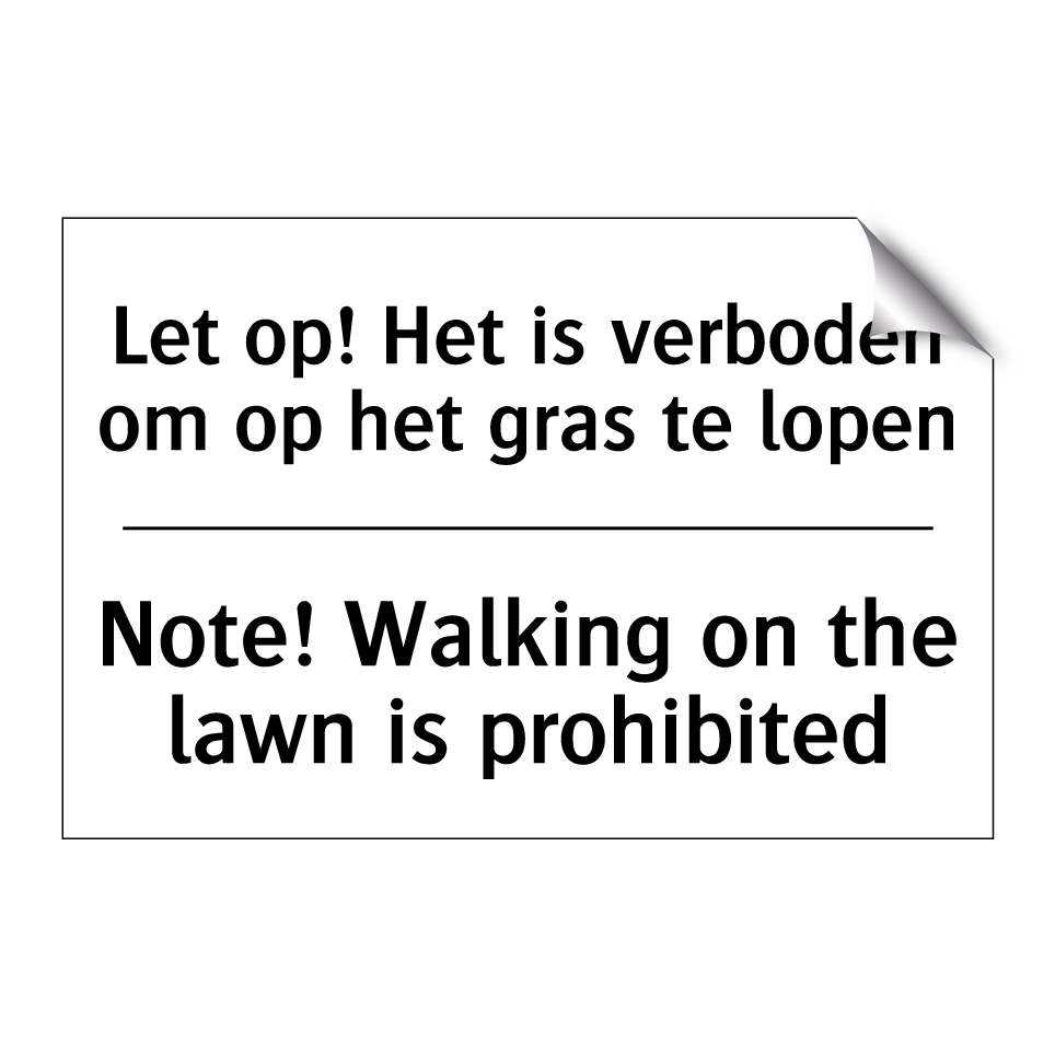 Verbodsbord met de tekst Let op! Het is verboden om op het gras te lopen en in het Engels: Note! Walking on the lawn is prohibited