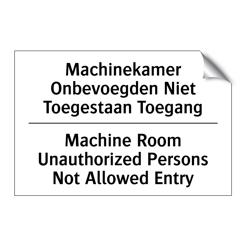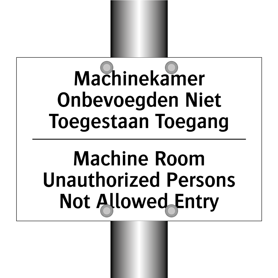 Verbodsbord met de tekst Machinekamer Onbevoegden Niet Toegestaan Toegang en in het Engels: Machine Room Unauthorized Persons Not Allowed Entry