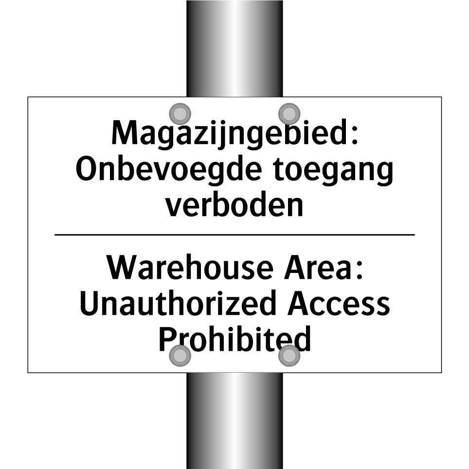 Verbodsbord met de tekst Magazijngebied: Onbevoegde toegang verboden en in het Engels: Warehouse Area: Unauthorized Access Prohibited