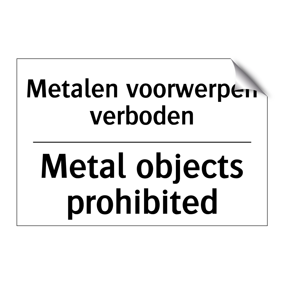 Verbodsbord met de tekst Metalen voorwerpen verboden en in het Engels: Metal objects prohibited