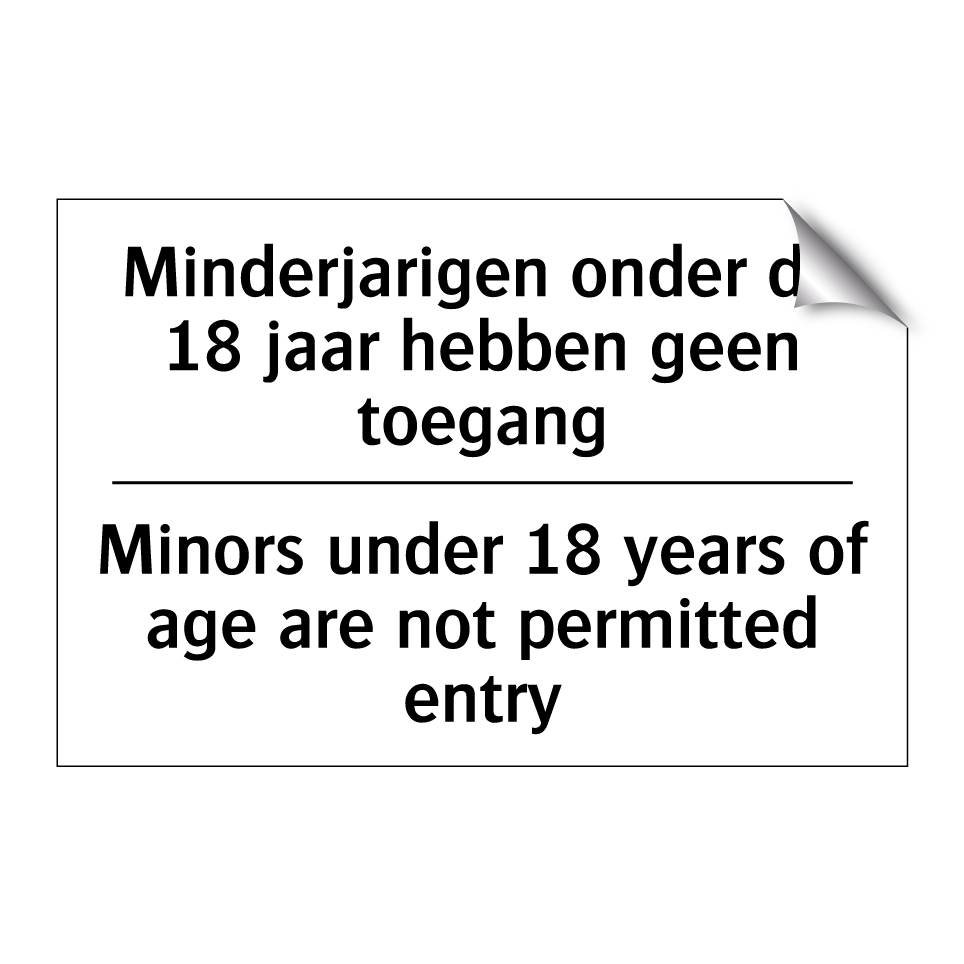 Verbodsbord met de tekst Minderjarigen onder de 18 jaar hebben geen toegang en in het Engels: Minors under 18 years of age are not permitted entry