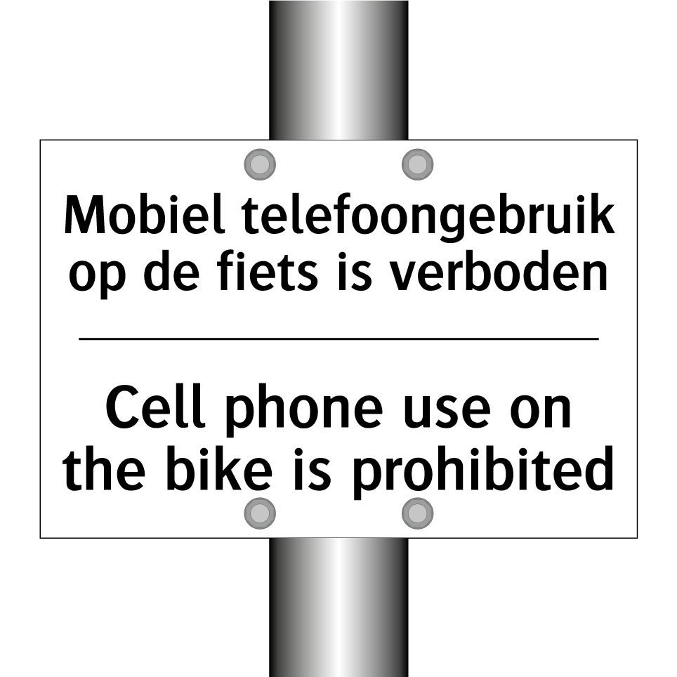 Verbodsbord met de tekst Mobiel telefoongebruik op de fiets is verboden en in het Engels: Cell phone use on the bike is prohibited