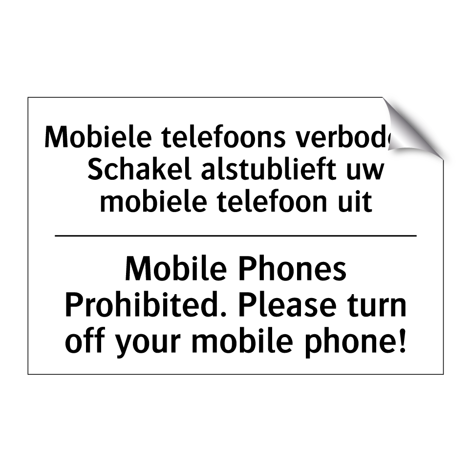 Verbodsbord met de tekst Mobiele telefoons verboden. Schakel alstublieft uw mobiele telefoon uit en in het Engels: Mobile Phones Prohibited. Please turn off your mobile phone!