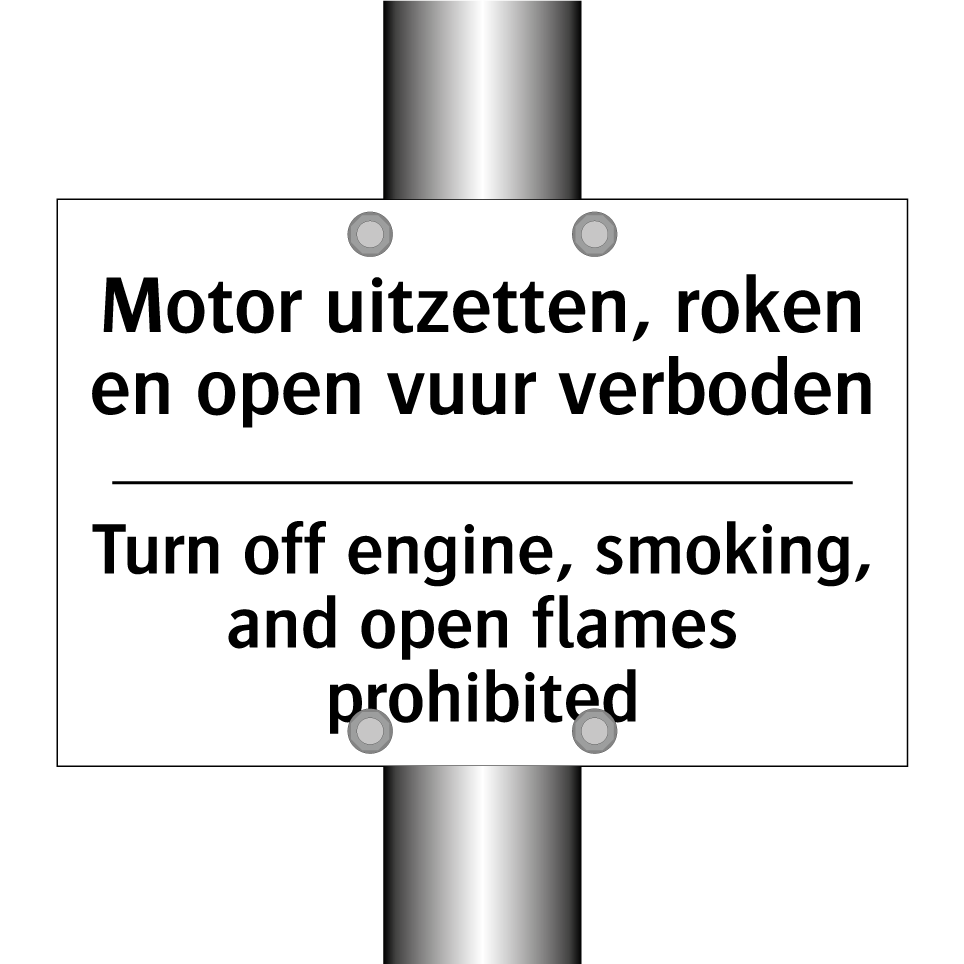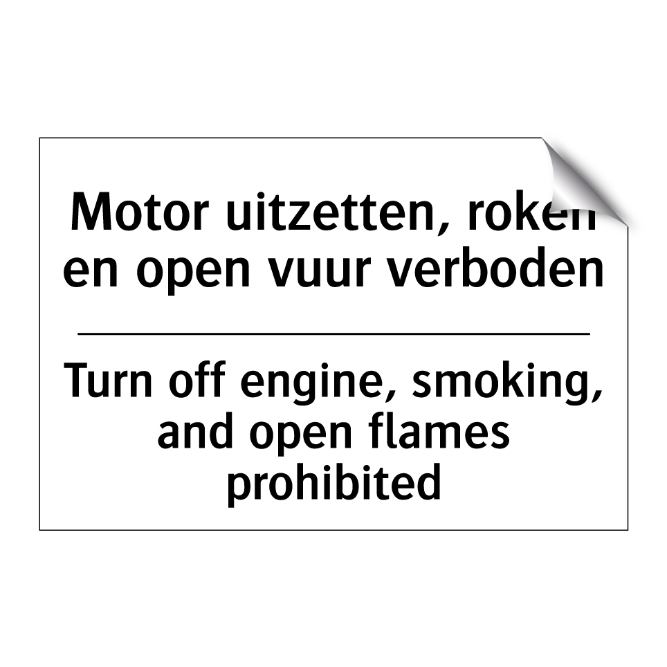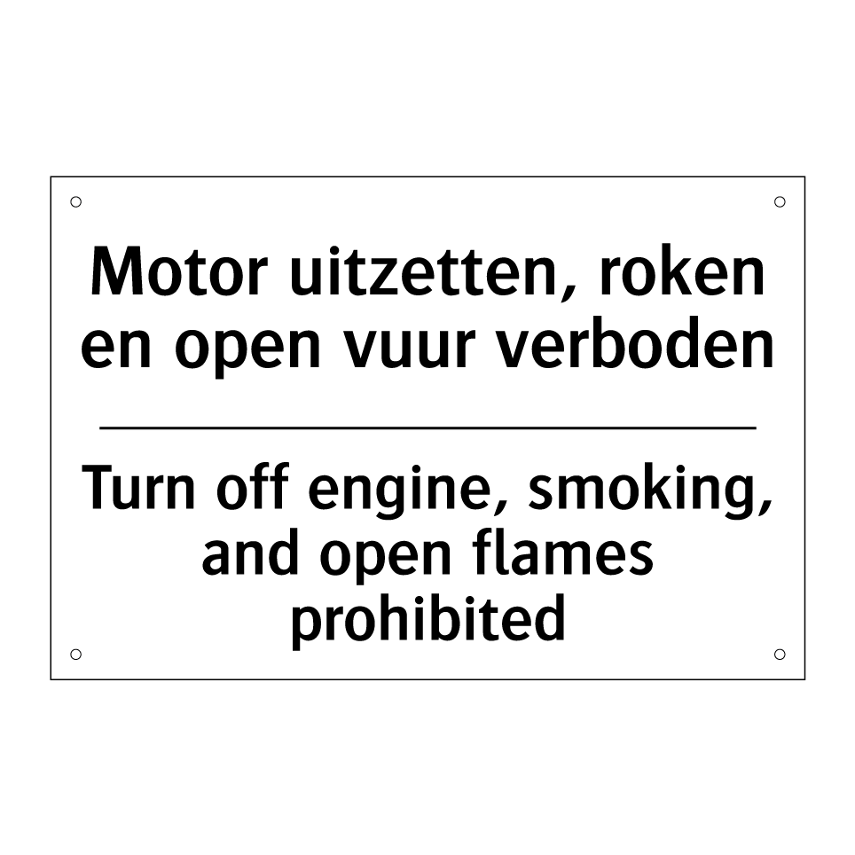 Verbodsbord met de tekst Motor uitzetten, roken en open vuur verboden en in het Engels: Turn off engine, smoking, and open flames prohibited