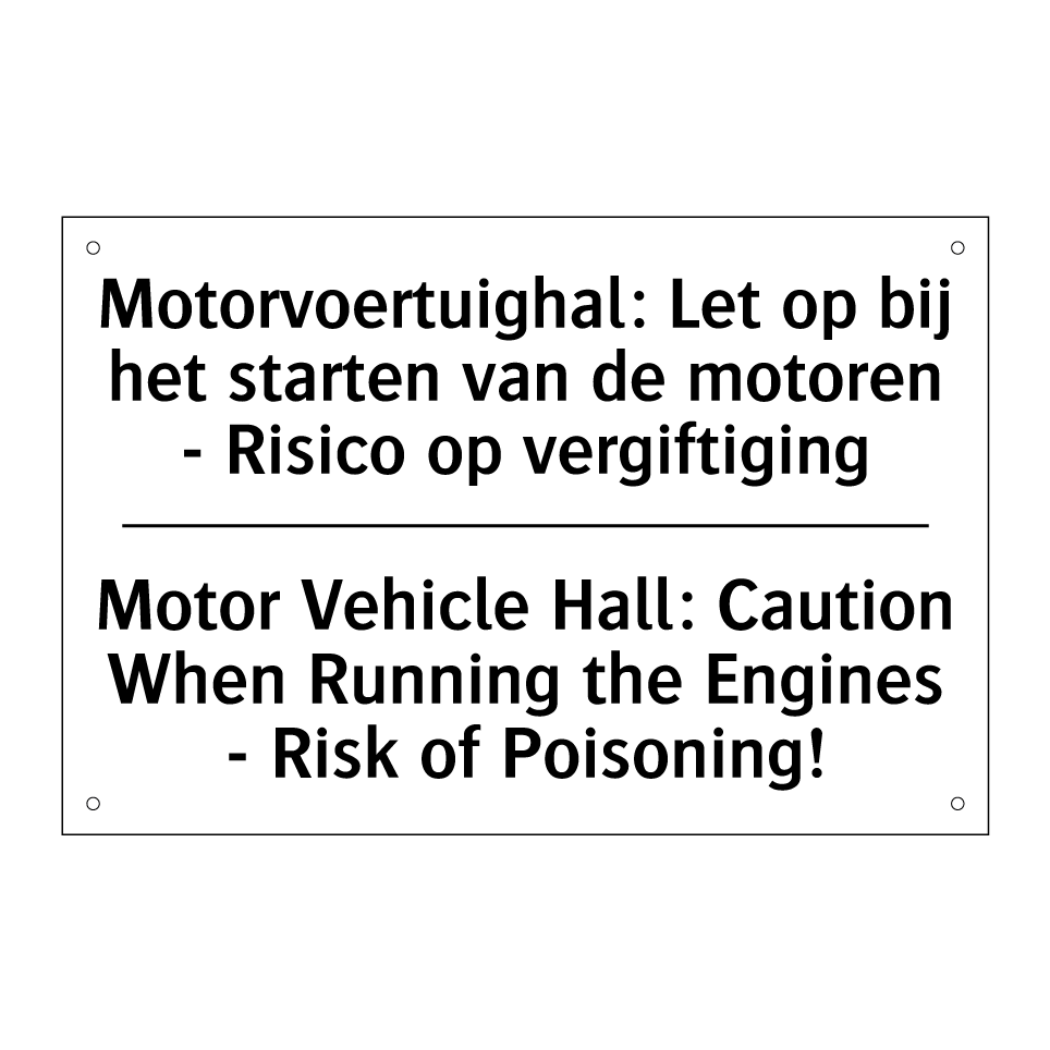 Verbodsbord met de tekst Motorvoertuighal: Let op bij het starten van de motoren - Risico op vergiftiging en in het Engels: Motor Vehicle Hall: Caution When Running the Engines - Risk of Poisoning!