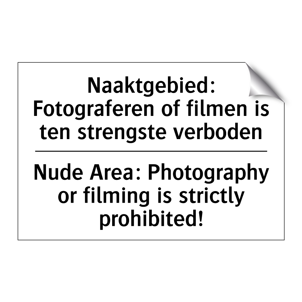 Verbodsbord met de tekst Naaktgebied: Fotograferen of filmen is ten strengste verboden en in het Engels: Nude Area: Photography or filming is strictly prohibited!