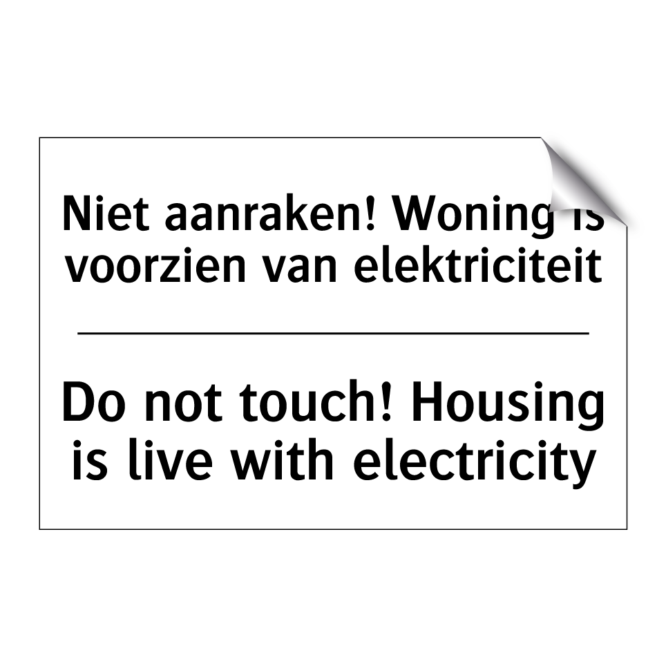 Verbodsbord met de tekst Niet aanraken! Woning is voorzien van elektriciteit en in het Engels: Do not touch! Housing is live with electricity