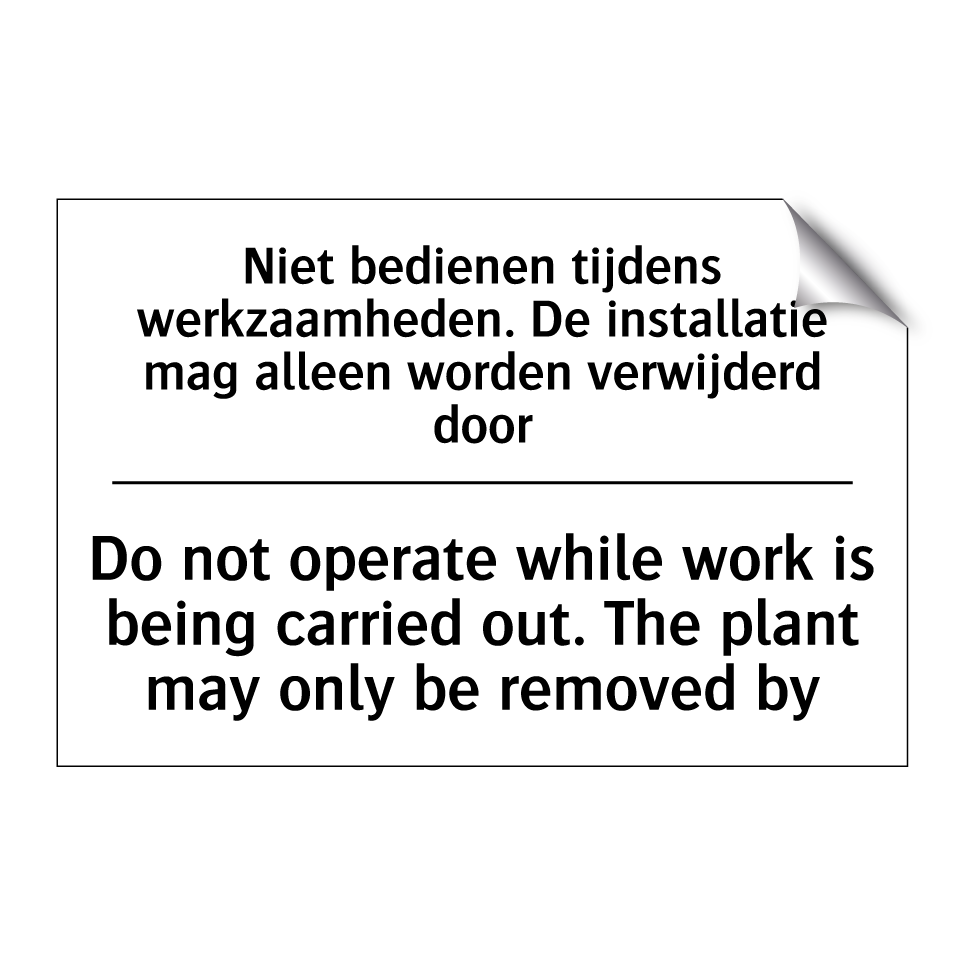 Verbodsbord met de tekst Niet bedienen tijdens werkzaamheden. De installatie mag alleen worden verwijderd door en in het Engels: Do not operate while work is being carried out. The plant may only be removed by