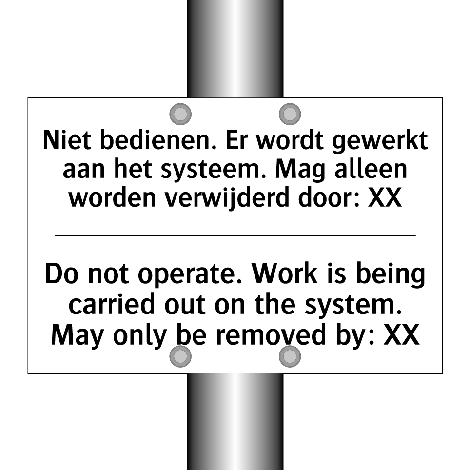 Verbodsbord met de tekst Niet bedienen. Er wordt gewerkt aan het systeem. Mag alleen worden verwijderd door: XX en in het Engels: Do not operate. Work is being carried out on the system. May only be removed by: XX