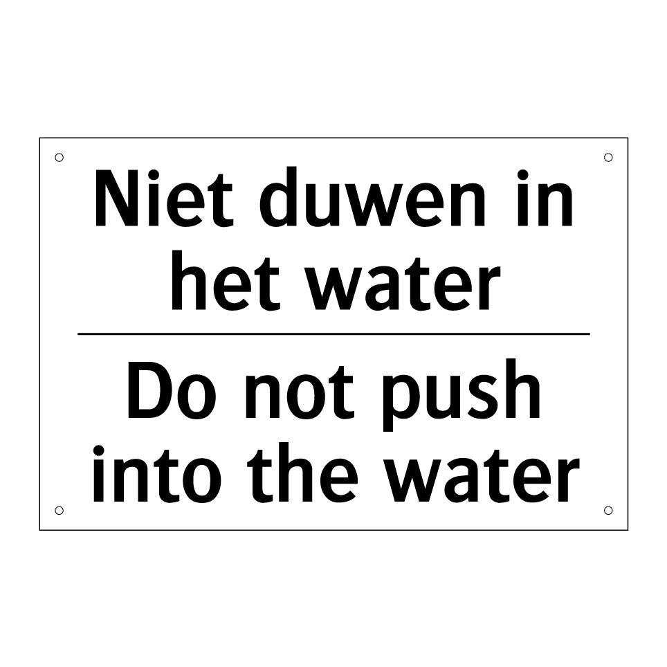 Verbodsbord met de tekst Niet duwen in het water en in het Engels: Do not push into the water