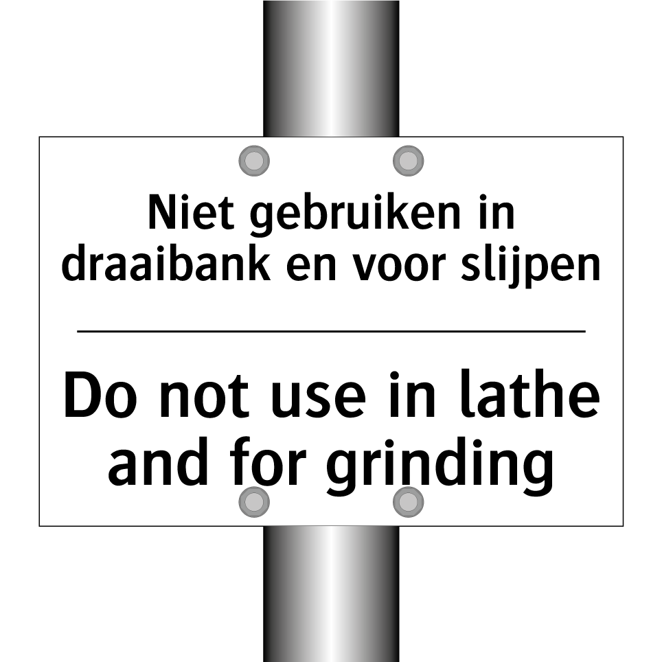 Verbodsbord met de tekst Niet gebruiken in draaibank en voor slijpen en in het Engels: Do not use in lathe and for grinding