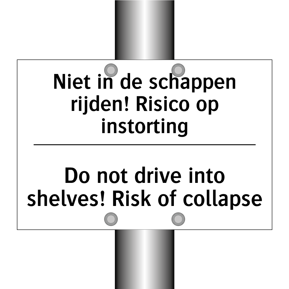 Verbodsbord met de tekst Niet in de schappen rijden! Risico op instorting en in het Engels: Do not drive into shelves! Risk of collapse