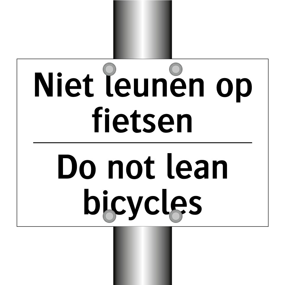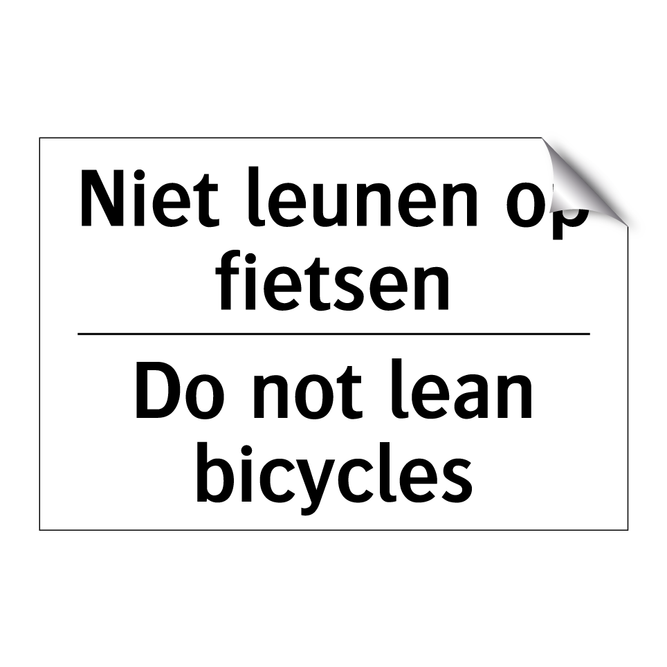Verbodsbord met de tekst Niet leunen op fietsen en in het Engels: Do not lean bicycles