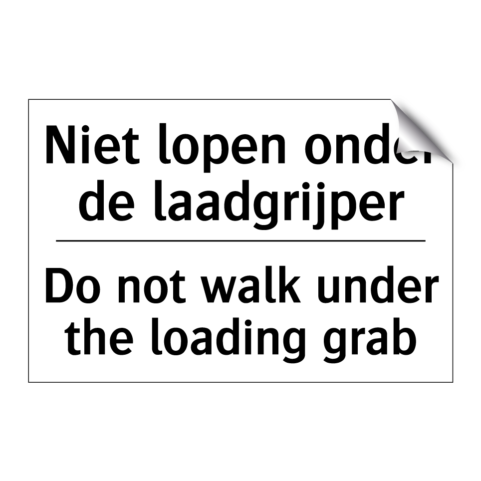 Verbodsbord met de tekst Niet lopen onder de laadgrijper en in het Engels: Do not walk under the loading grab