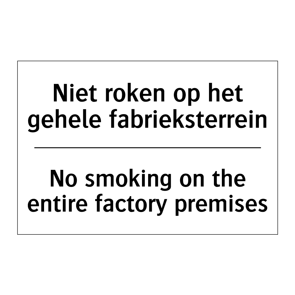 Verbodsbord met de tekst Niet roken op het gehele fabrieksterrein en in het Engels: No smoking on the entire factory premises