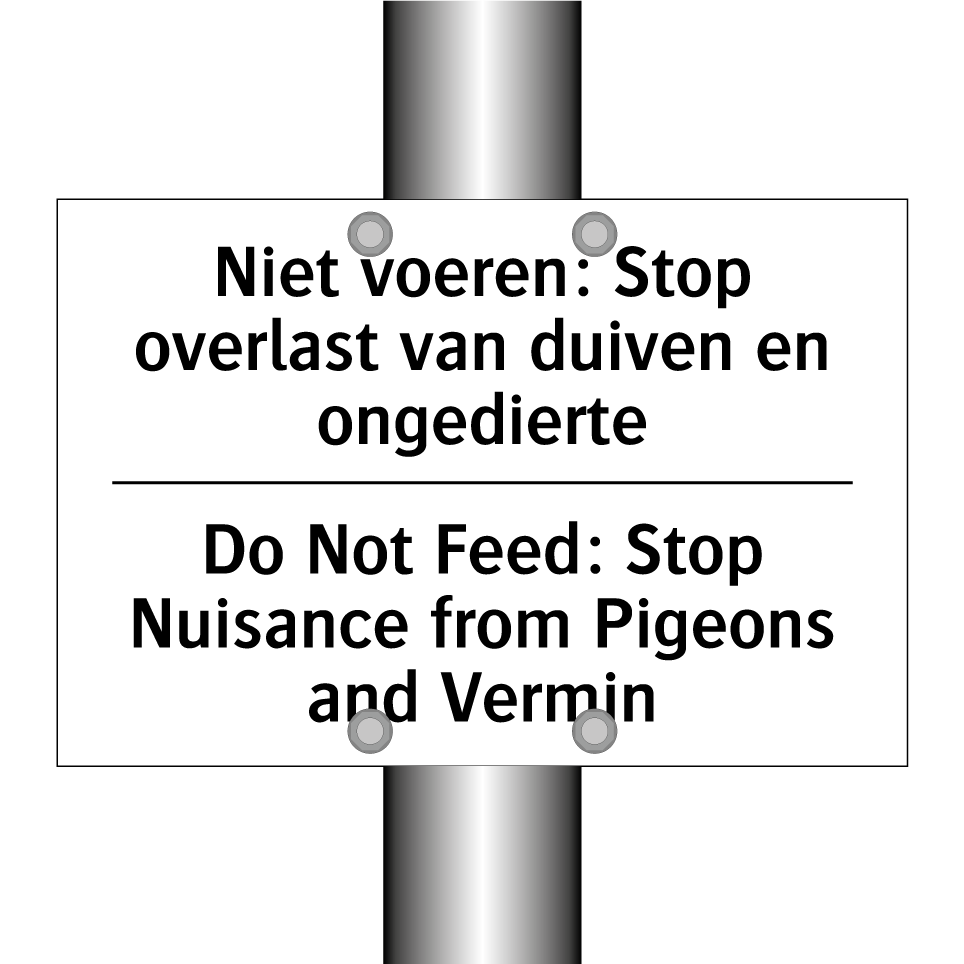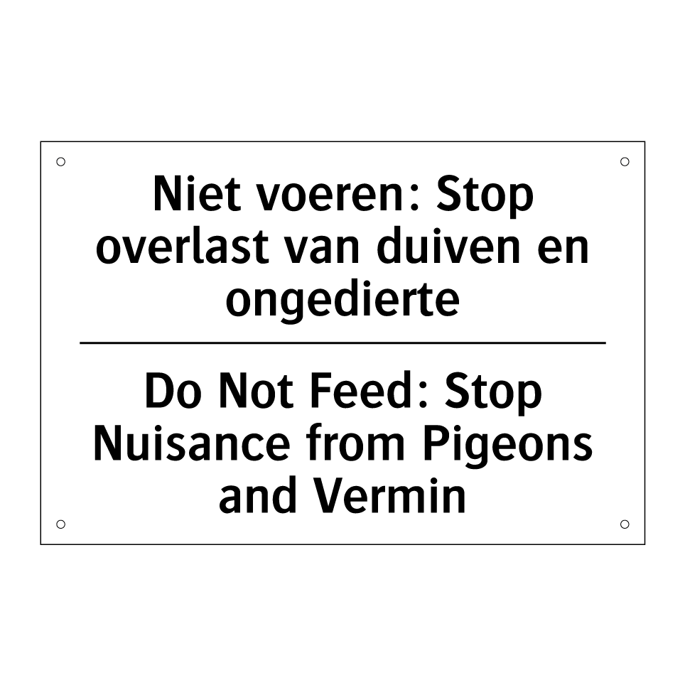 Verbodsbord met de tekst Niet voeren: Stop overlast van duiven en ongedierte en in het Engels: Do Not Feed: Stop Nuisance from Pigeons and Vermin