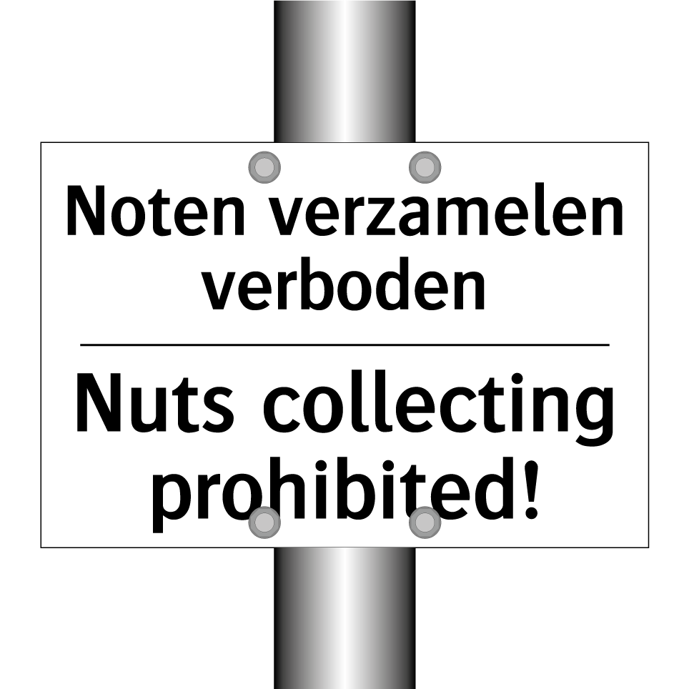 Verbodsbord met de tekst Noten verzamelen verboden en in het Engels: Nuts collecting prohibited!