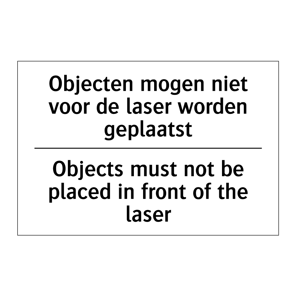 Verbodsbord met de tekst Objecten mogen niet voor de laser worden geplaatst en in het Engels: Objects must not be placed in front of the laser