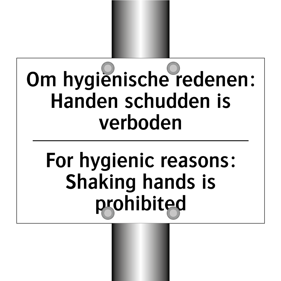 Verbodsbord met de tekst Om hygiënische redenen: Handen schudden is verboden en in het Engels: For hygienic reasons: Shaking hands is prohibited