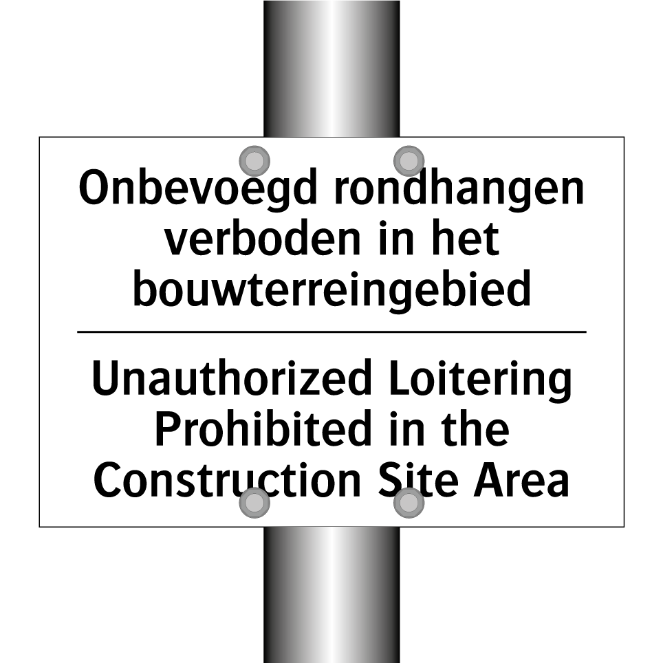 Verbodsbord met de tekst Onbevoegd rondhangen verboden in het bouwterreingebied en in het Engels: Unauthorized Loitering Prohibited in the Construction Site Area