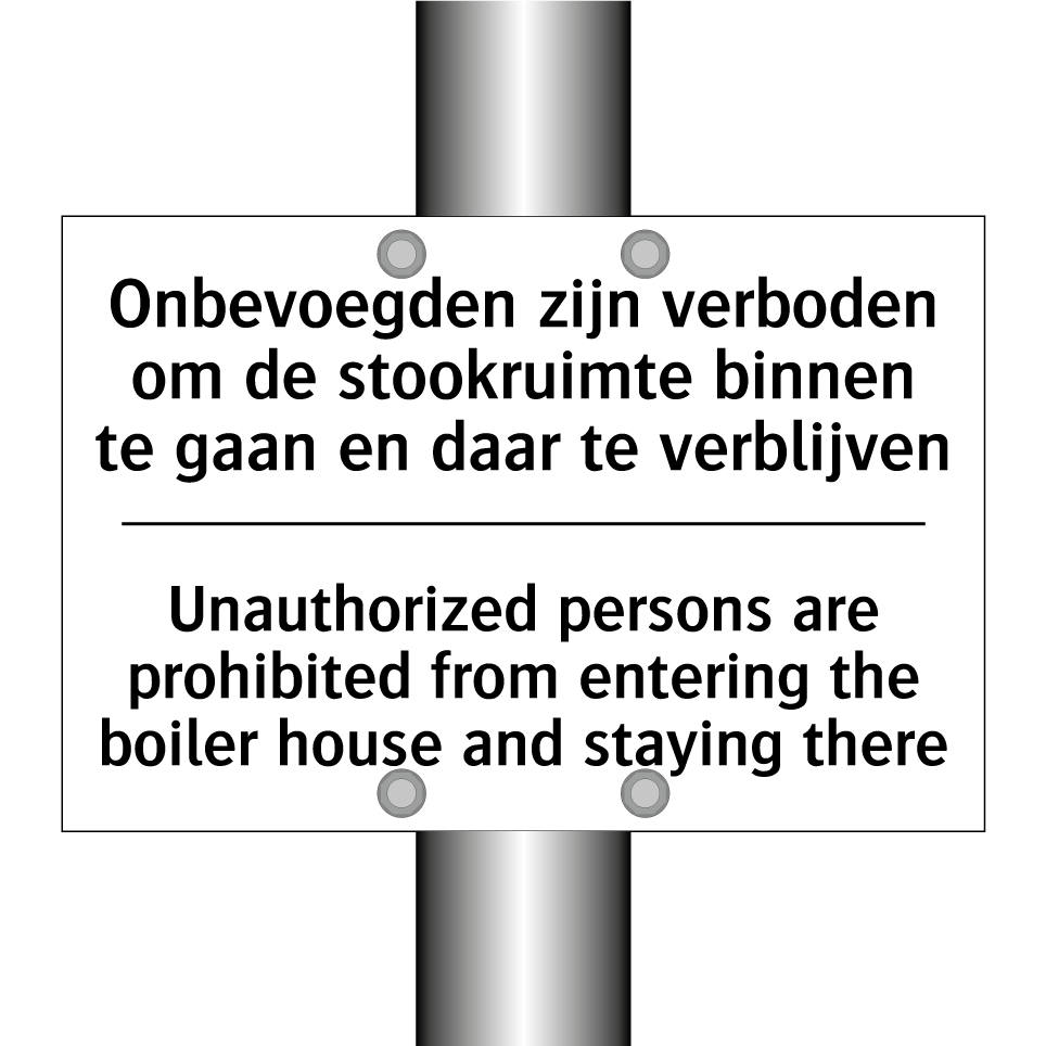 Verbodsbord met de tekst Onbevoegden zijn verboden om de stookruimte binnen te gaan en daar te verblijven en in het Engels: Unauthorized persons are prohibited from entering the boiler house and staying there