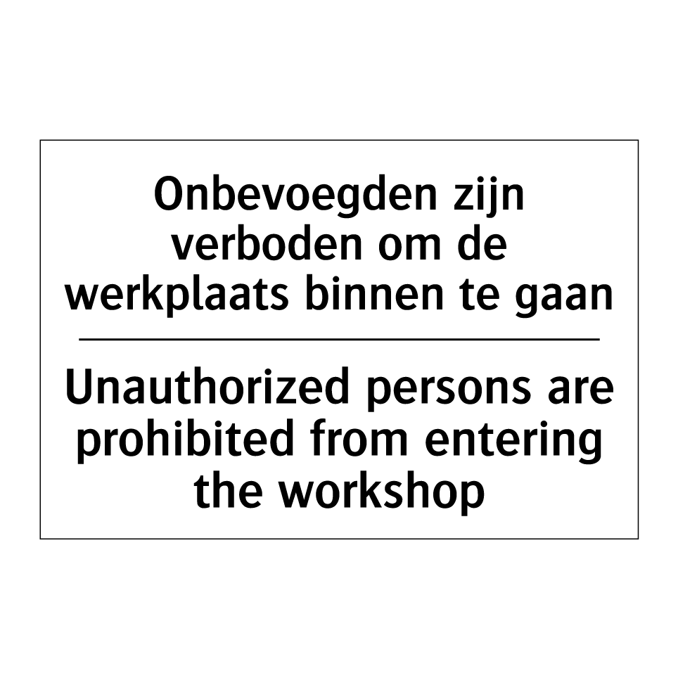 Verbodsbord met de tekst Onbevoegden zijn verboden om de werkplaats binnen te gaan en in het Engels: Unauthorized persons are prohibited from entering the workshop
