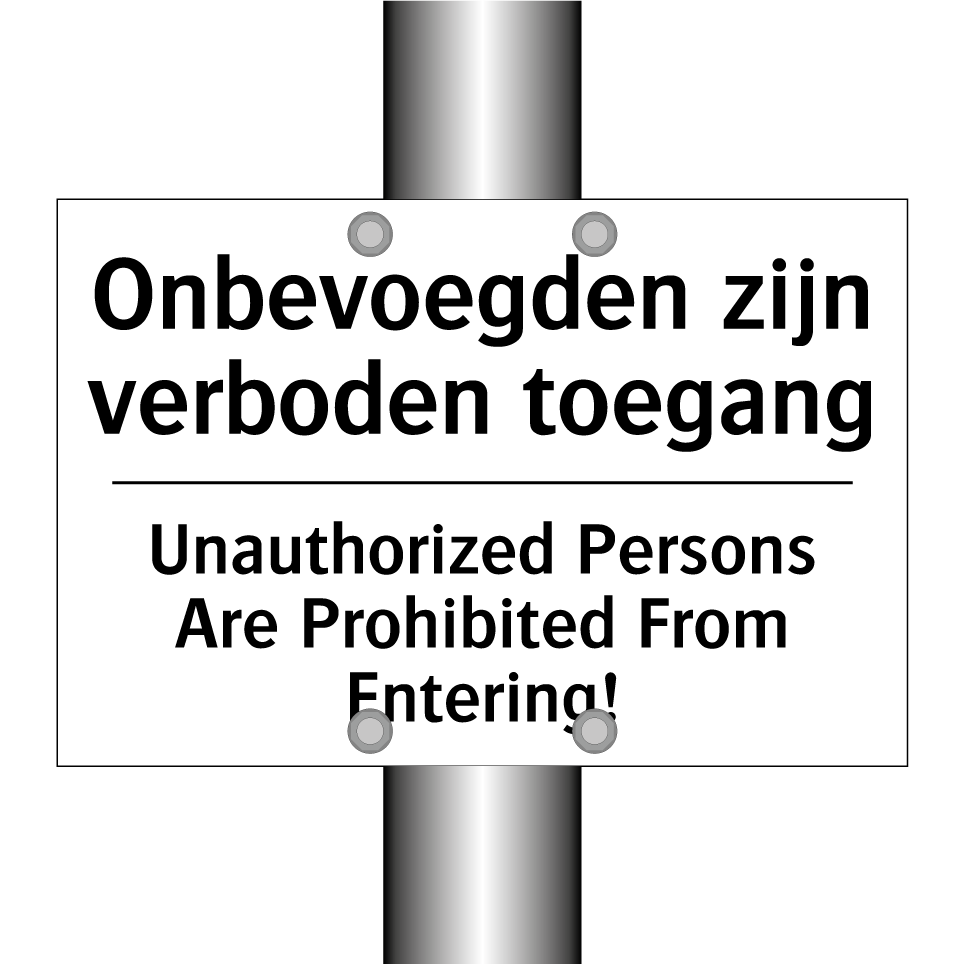 Verbodsbord met de tekst Onbevoegden zijn verboden toegang en in het Engels: Unauthorized Persons Are Prohibited From Entering!