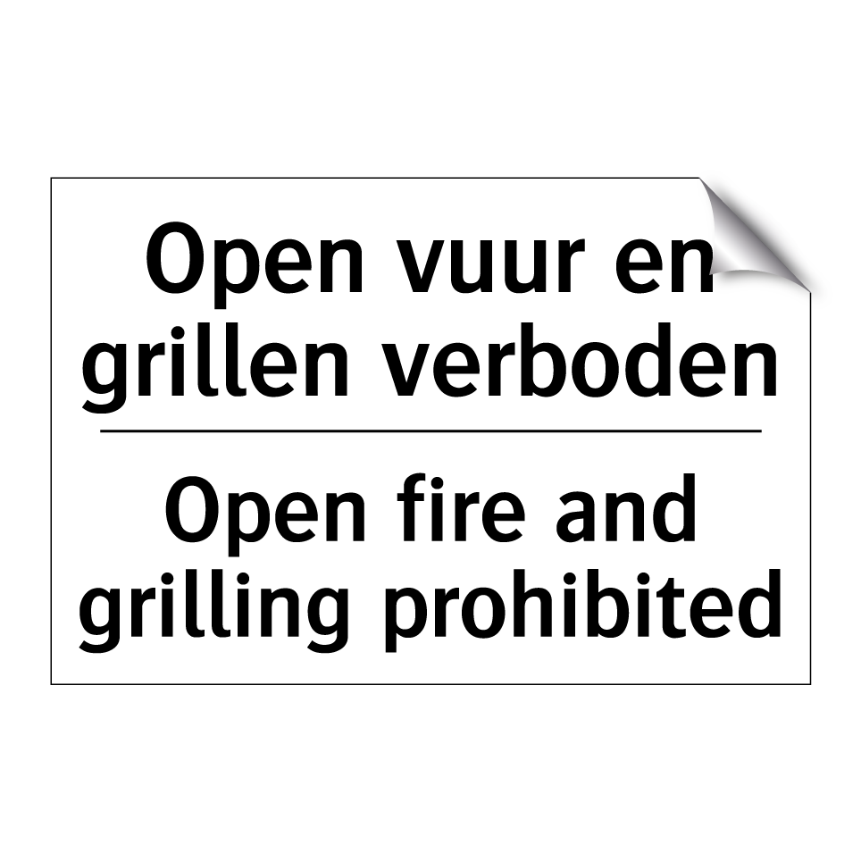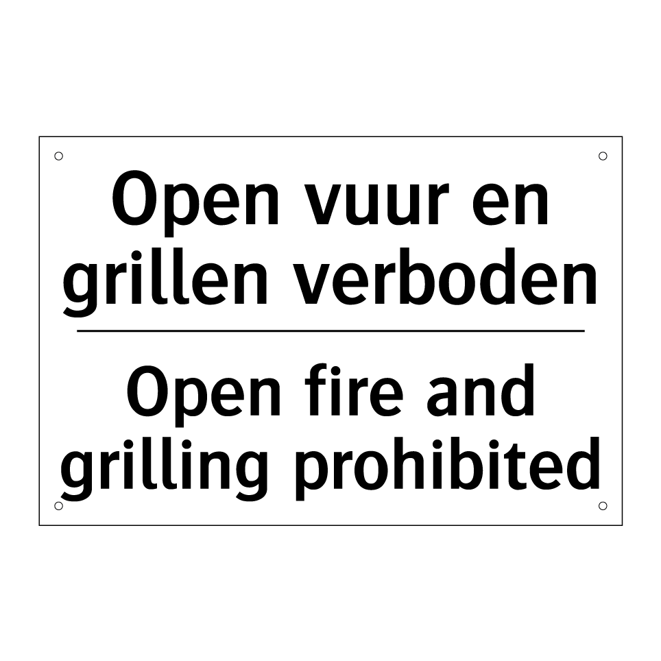 Verbodsbord met de tekst Open vuur en grillen verboden en in het Engels: Open fire and grilling prohibited