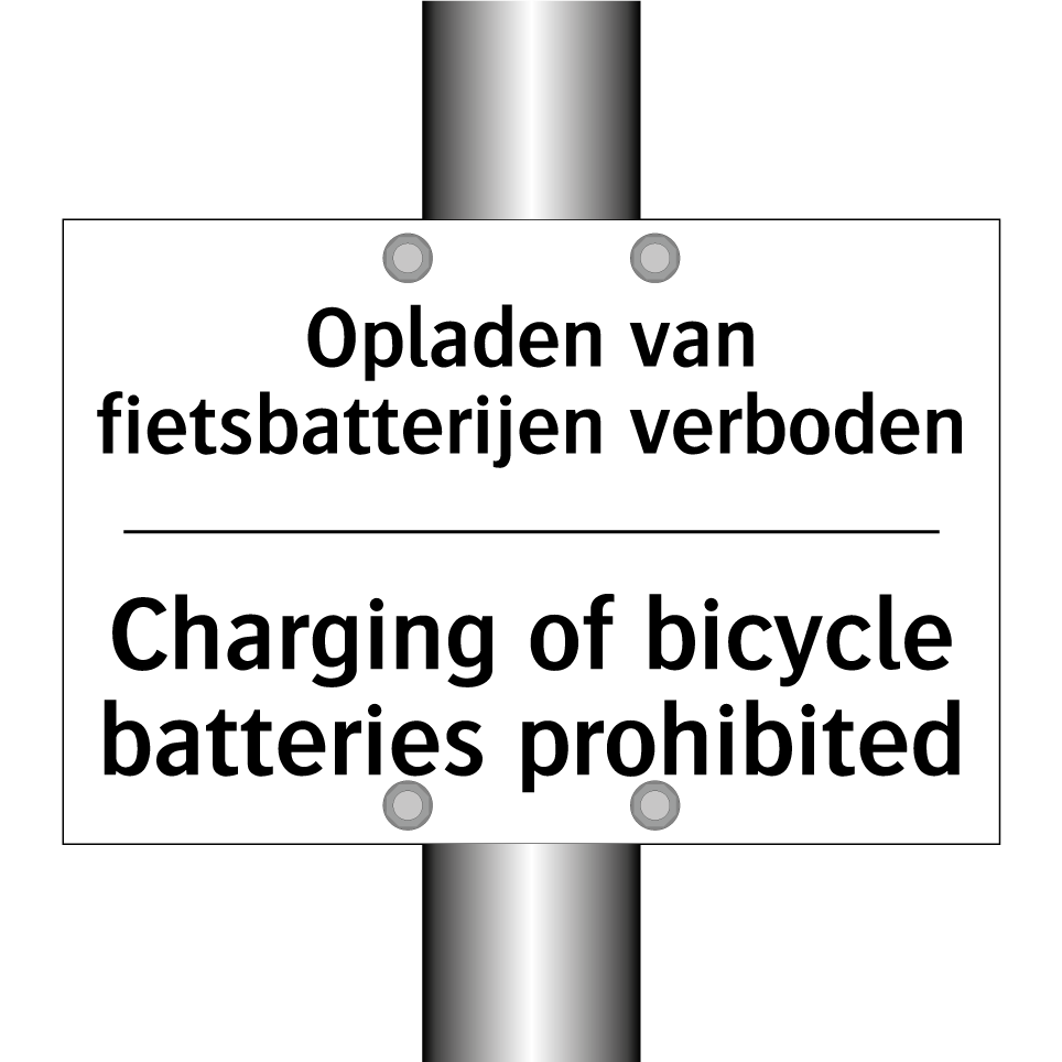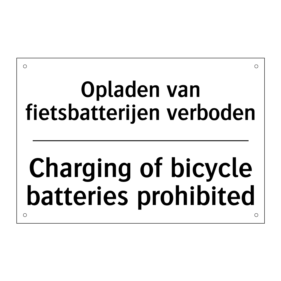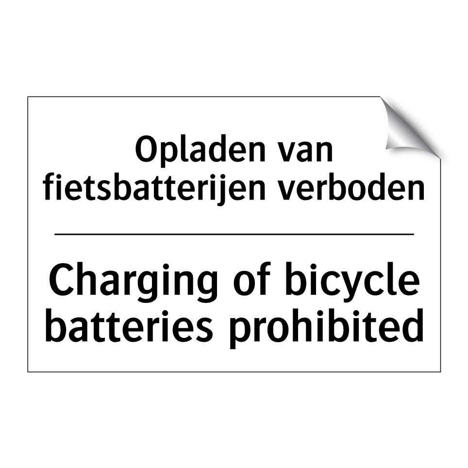 Verbodsbord met de tekst Opladen van fietsbatterijen verboden en in het Engels: Charging of bicycle batteries prohibited