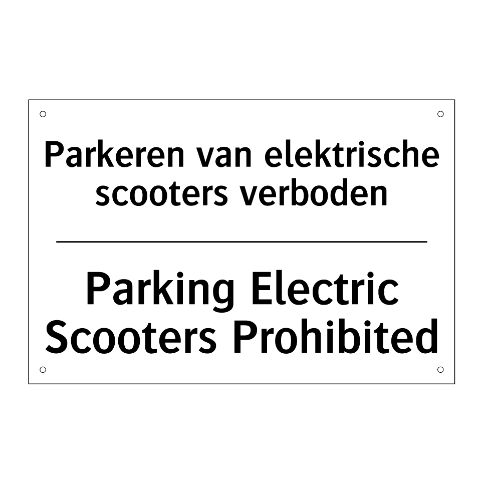 Verbodsbord met de tekst Parkeren van elektrische scooters verboden en in het Engels: Parking Electric Scooters Prohibited