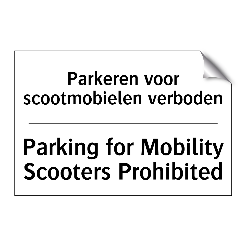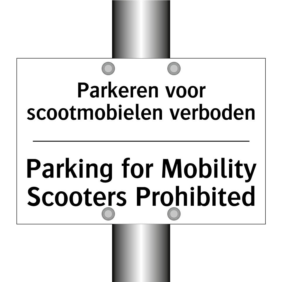Verbodsbord met de tekst Parkeren voor scootmobielen verboden en in het Engels: Parking for Mobility Scooters Prohibited