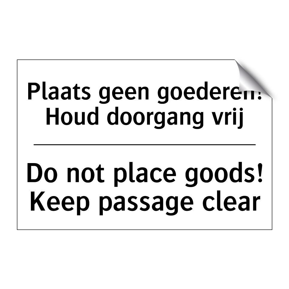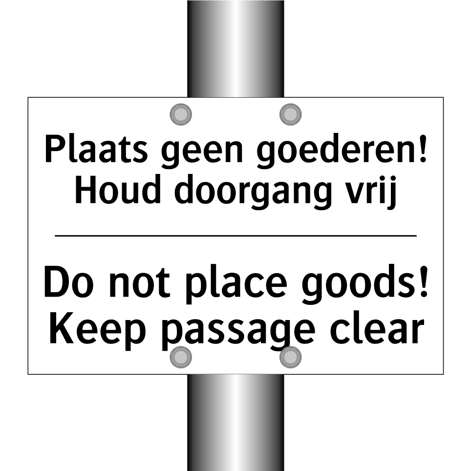 Verbodsbord met de tekst Plaats geen goederen! Houd doorgang vrij en in het Engels: Do not place goods! Keep passage clear