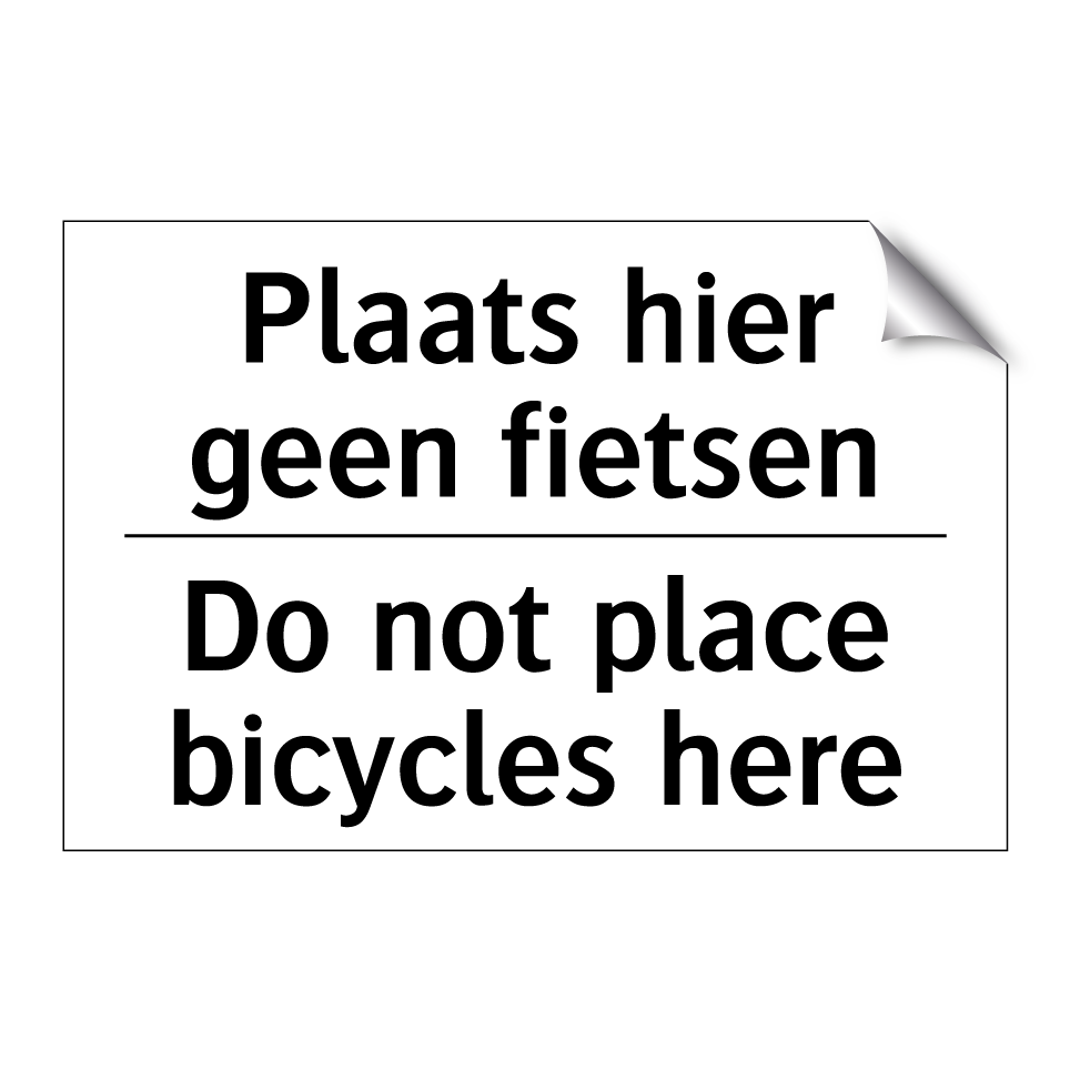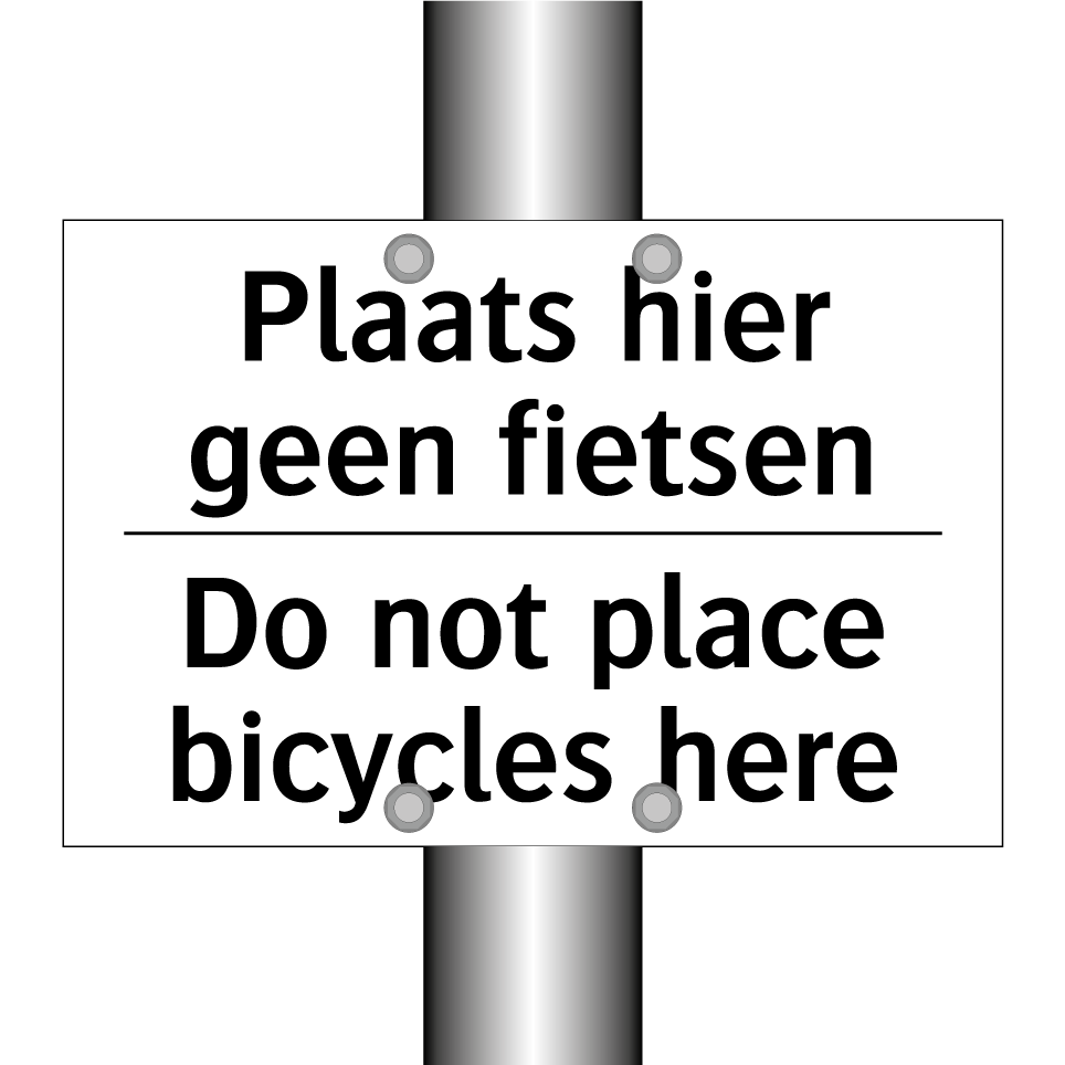 Verbodsbord met de tekst Plaats hier geen fietsen en in het Engels: Do not place bicycles here