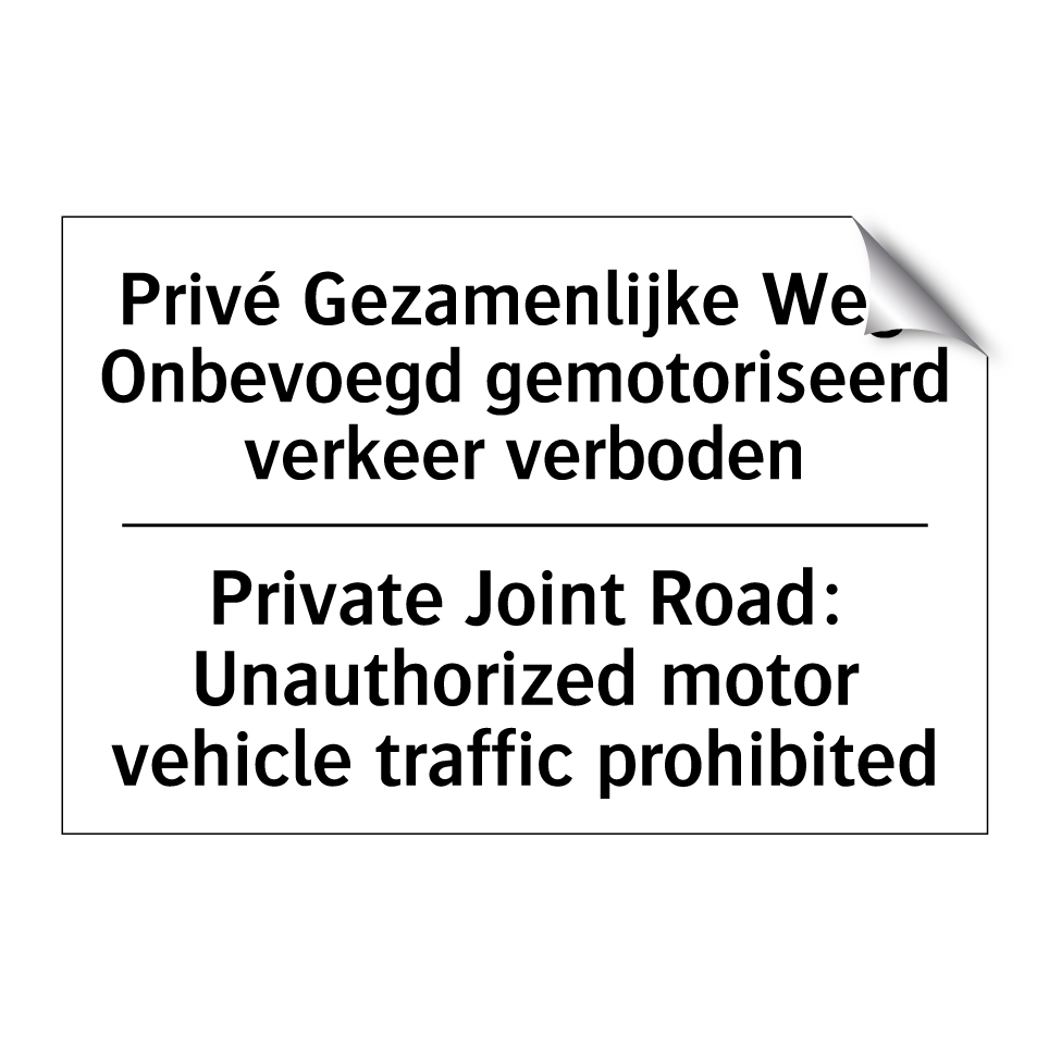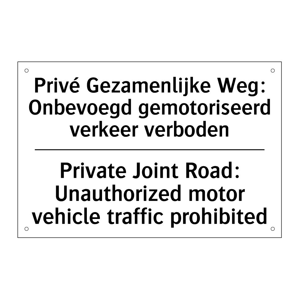 Verbodsbord met de tekst Privé Gezamenlijke Weg: Onbevoegd gemotoriseerd verkeer verboden en in het Engels: Private Joint Road: Unauthorized motor vehicle traffic prohibited