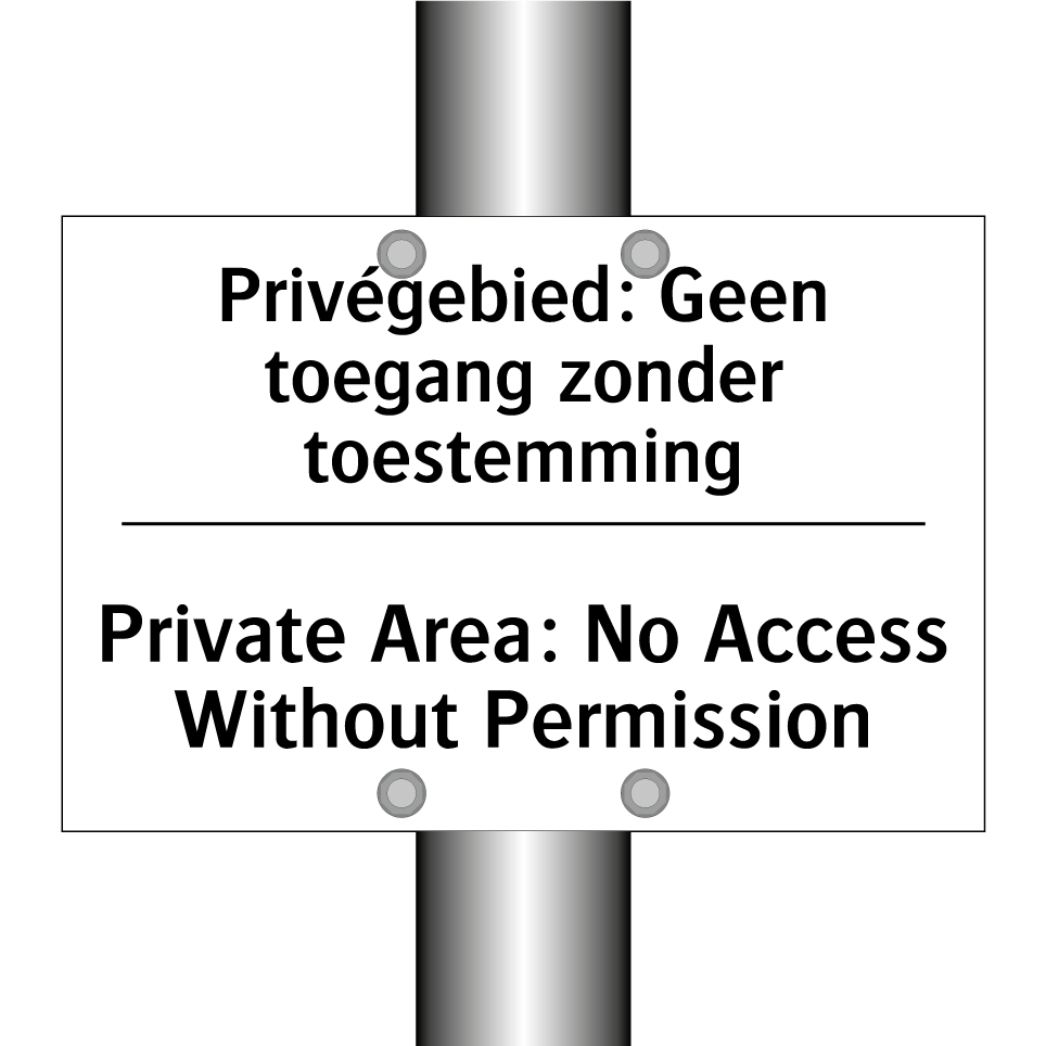 Verbodsbord met de tekst Privégebied: Geen toegang zonder toestemming en in het Engels: Private Area: No Access Without Permission