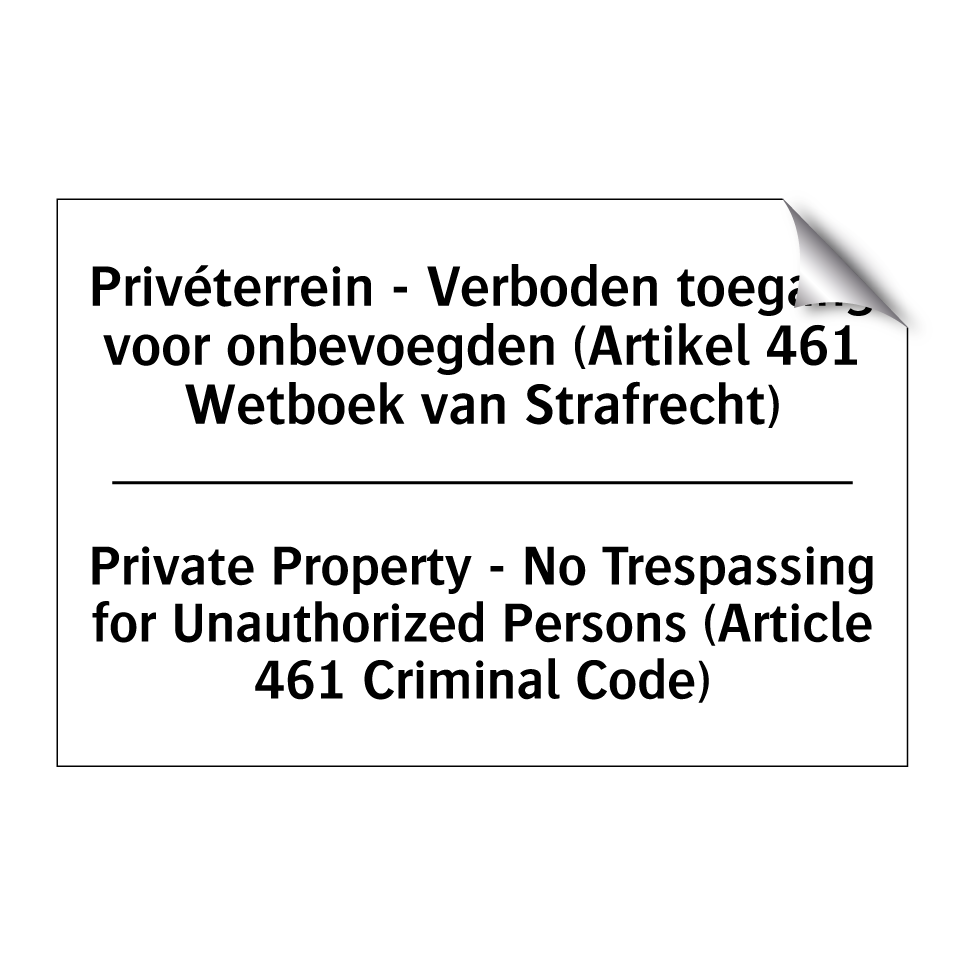Verbodsbord met de tekst Privéterrein - Verboden toegang voor onbevoegden (Artikel 461 Wetboek van Strafrecht) en in het Engels: Private Property - No Trespassing for Unauthorized Persons (Article 461 Criminal Code)