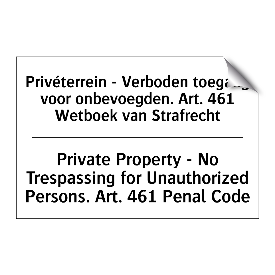 Verbodsbord met de tekst Privéterrein - Verboden toegang voor onbevoegden. Art. 461 Wetboek van Strafrecht en in het Engels: Private Property - No Trespassing for Unauthorized Persons. Art. 461 Penal Code