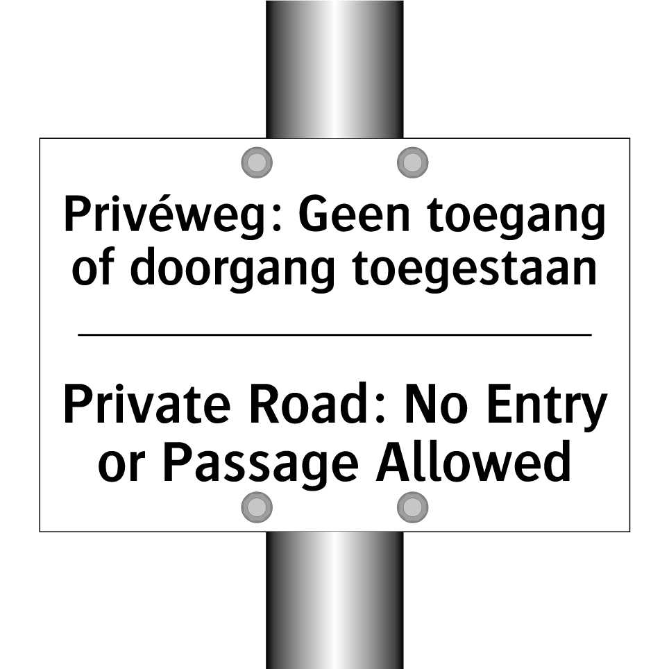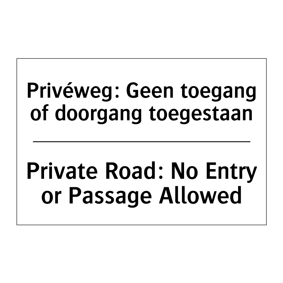 Verbodsbord met de tekst Privéweg: Geen toegang of doorgang toegestaan en in het Engels: Private Road: No Entry or Passage Allowed