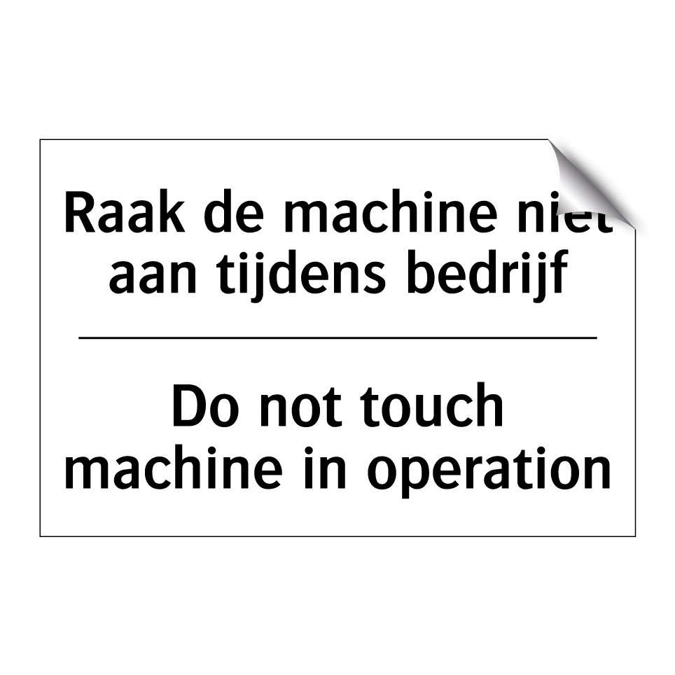 Verbodsbord met de tekst Raak de machine niet aan tijdens bedrijf en in het Engels: Do not touch machine in operation