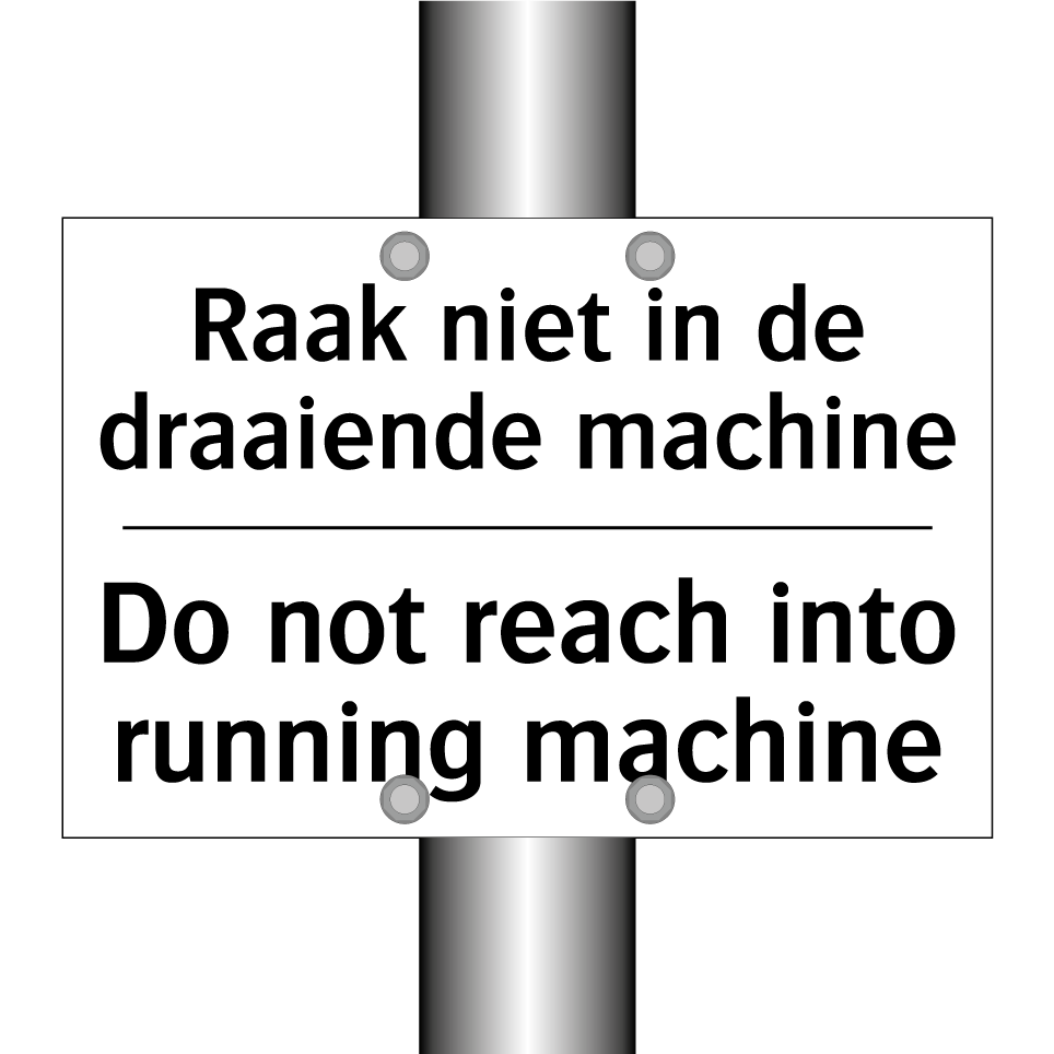 Verbodsbord met de tekst Raak niet in de draaiende machine en in het Engels: Do not reach into running machine
