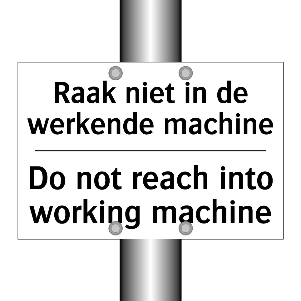 Verbodsbord met de tekst Raak niet in de werkende machine en in het Engels: Do not reach into working machine