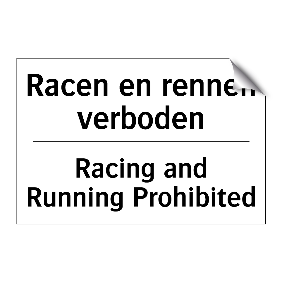 Verbodsbord met de tekst Racen en rennen verboden en in het Engels: Racing and Running Prohibited
