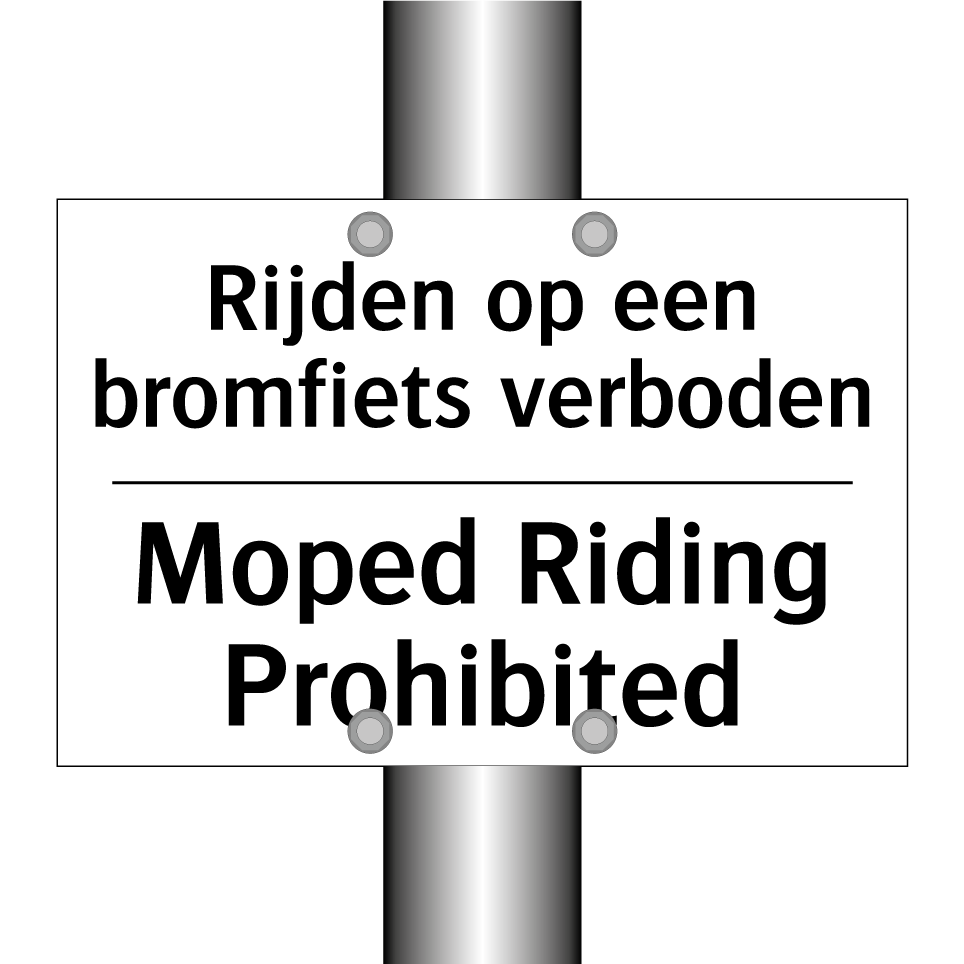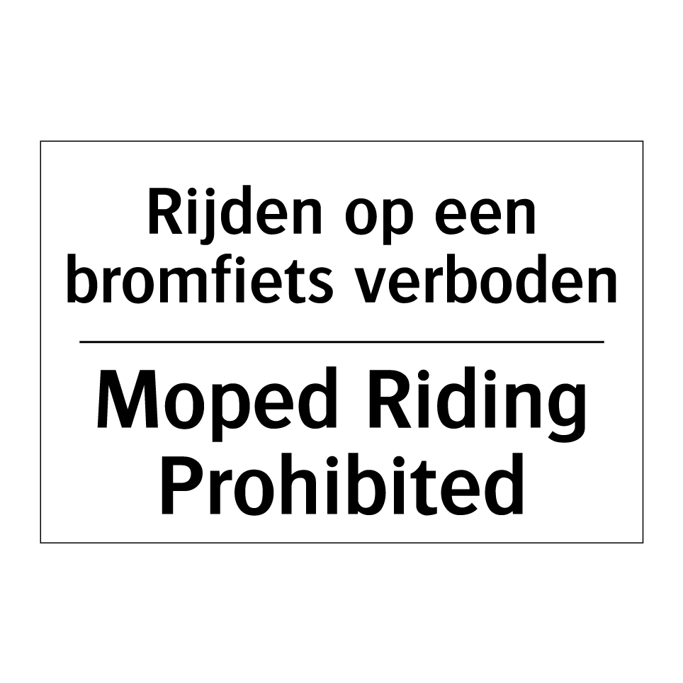Verbodsbord met de tekst Rijden op een bromfiets verboden en in het Engels: Moped Riding Prohibited