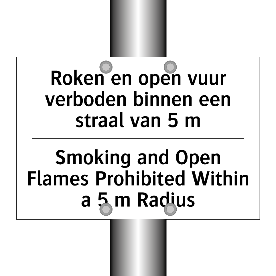 Verbodsbord met de tekst Roken en open vuur verboden binnen een straal van 5 m en in het Engels: Smoking and Open Flames Prohibited Within a 5 m Radius