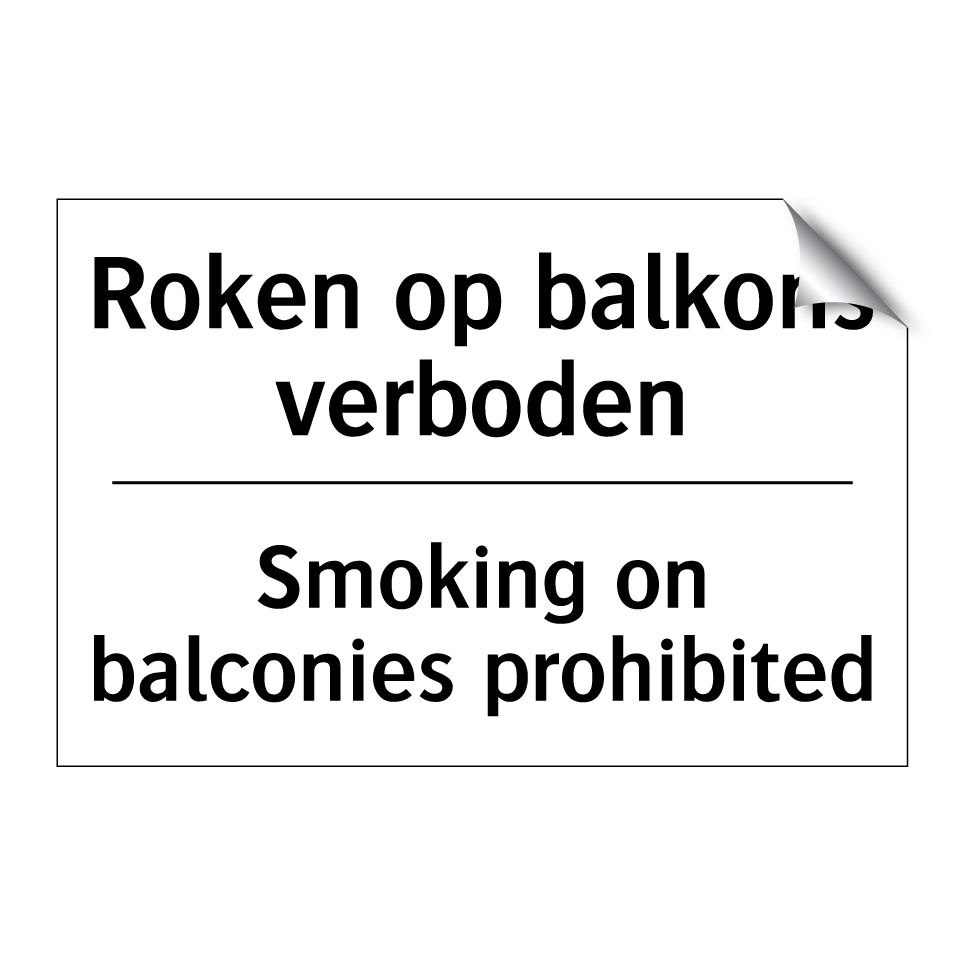 Verbodsbord met de tekst Roken op balkons verboden en in het Engels: Smoking on balconies prohibited