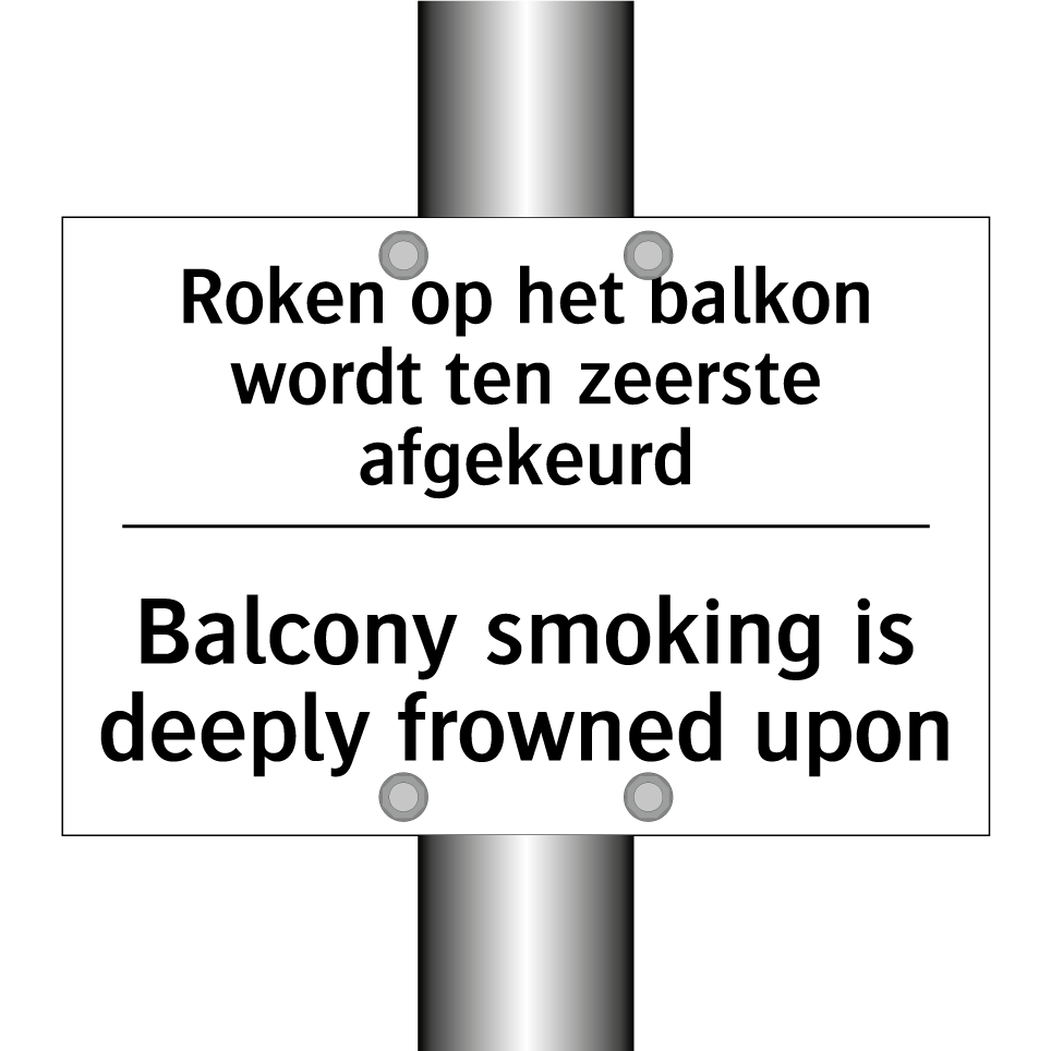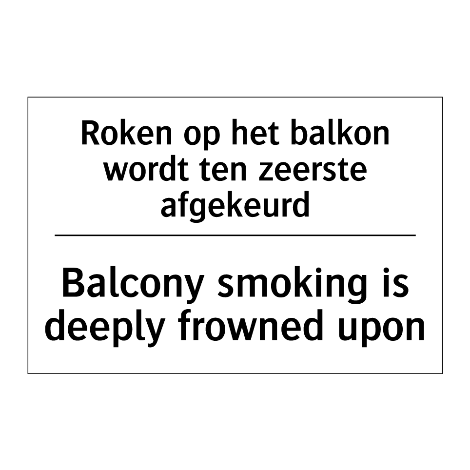 Verbodsbord met de tekst Roken op het balkon wordt ten zeerste afgekeurd en in het Engels: Balcony smoking is deeply frowned upon