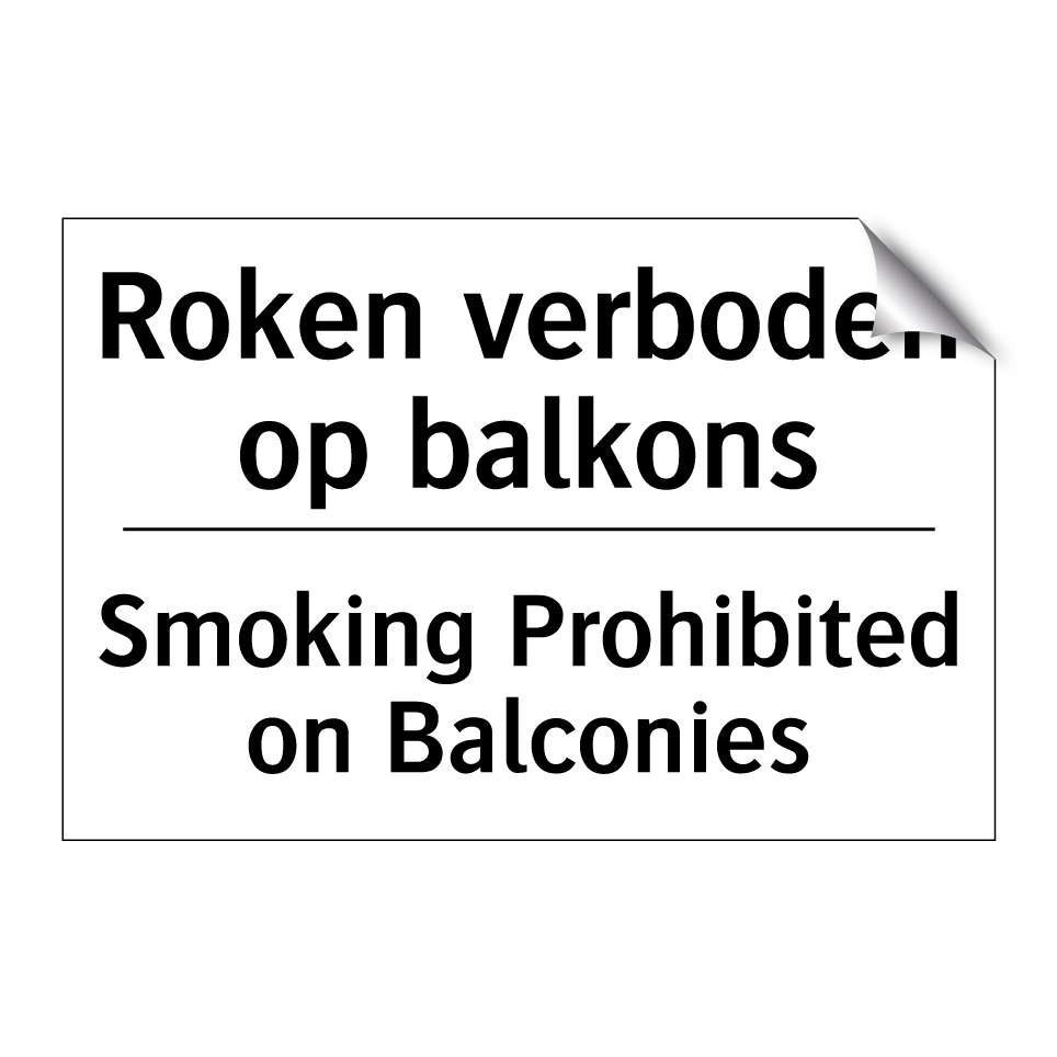 Verbodsbord met de tekst Roken verboden op balkons en in het Engels: Smoking Prohibited on Balconies