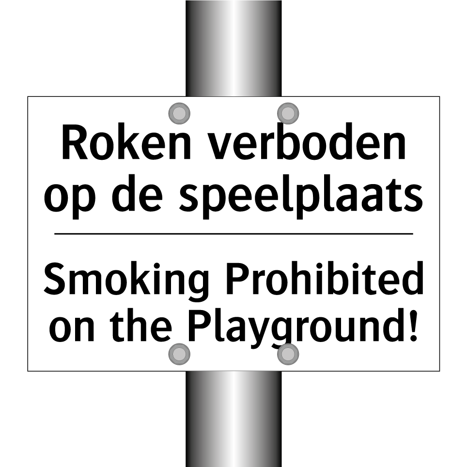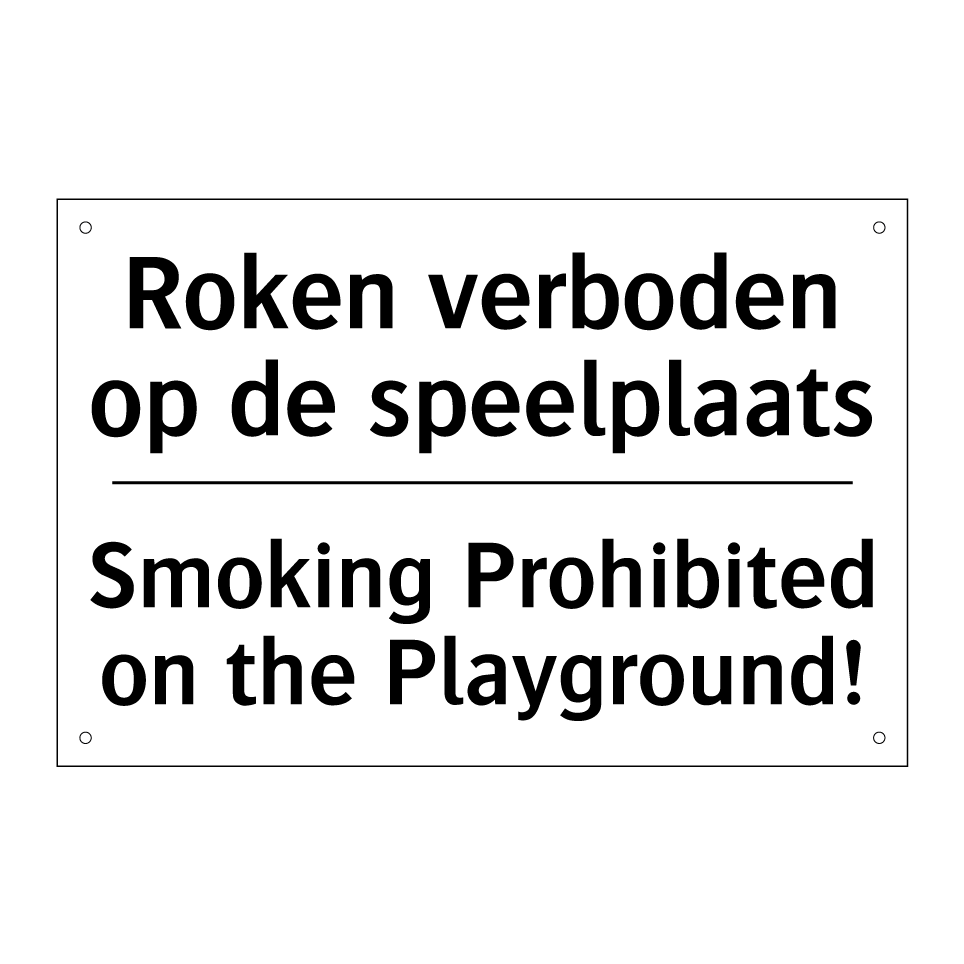 Verbodsbord met de tekst Roken verboden op de speelplaats en in het Engels: Smoking Prohibited on the Playground!